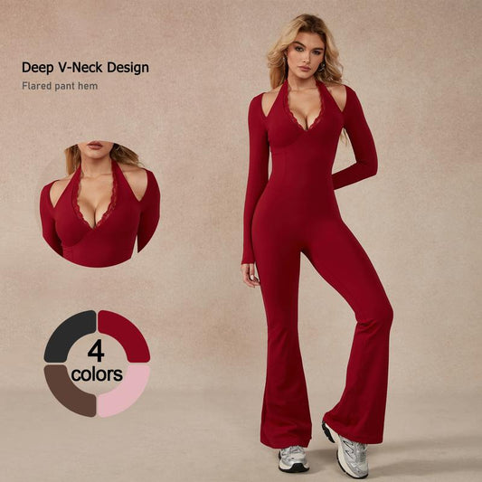 Timeoff Women'S Long-Sleeve Lace-Trim Halter Jumpsuit, Deep V-Neck & Flared Pant Hem, Solves Stylish Support & Flexible Fit Need for Yoga, Dance Workouts & Fashion-Forward Fitness Sessions,Jumpsuit Women